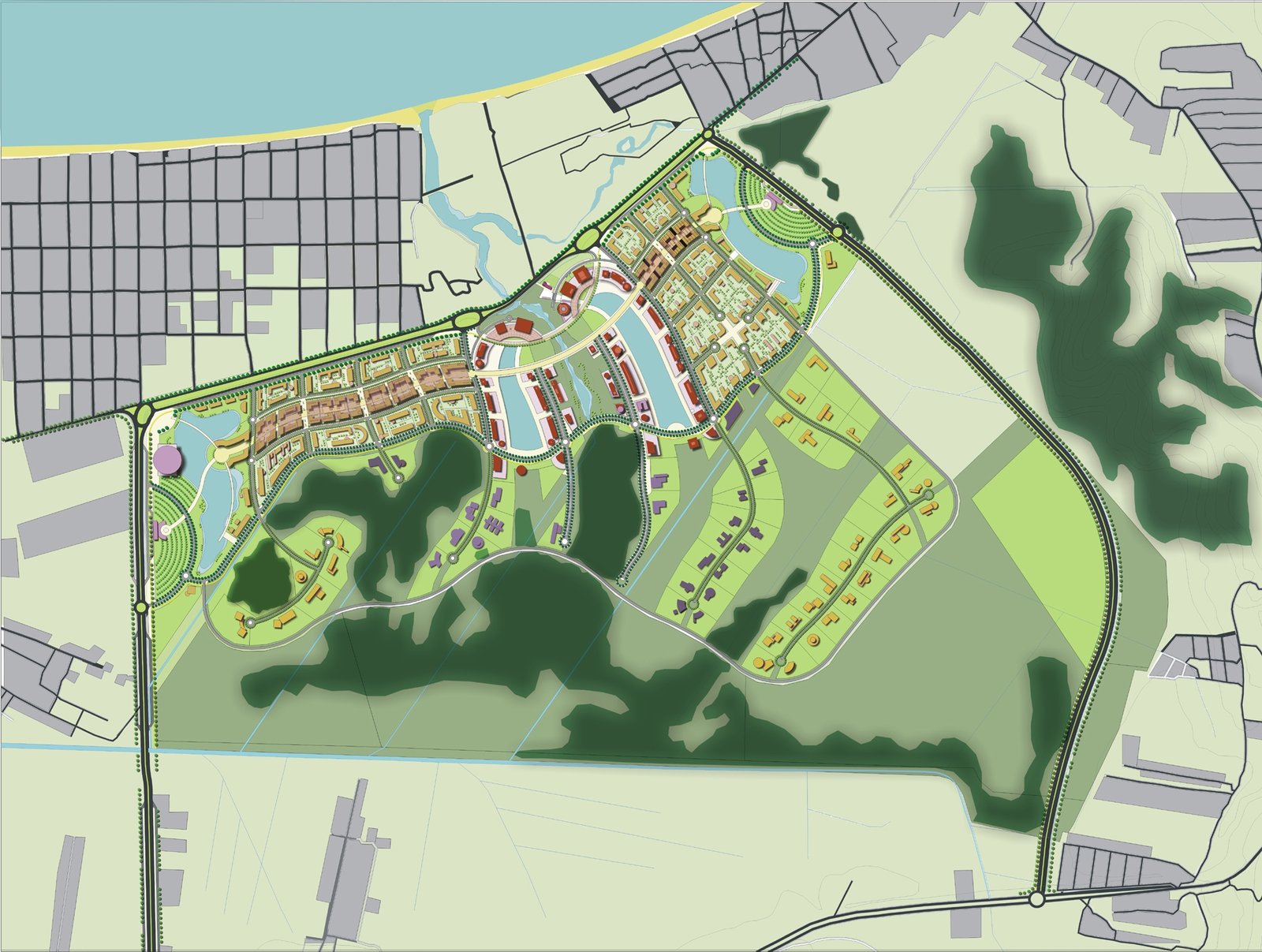 A estruturação urbana respeita a paisagem natural, preserva áreas sensíveis e potencializa conexões ambientais por meio de eixos verdes e zonas de amortecimento. O sistema viário foi concebido com lógica funcional, integrando-se à malha da cidade e promovendo acessibilidade universal, mobilidade ativa e circulação eficiente.